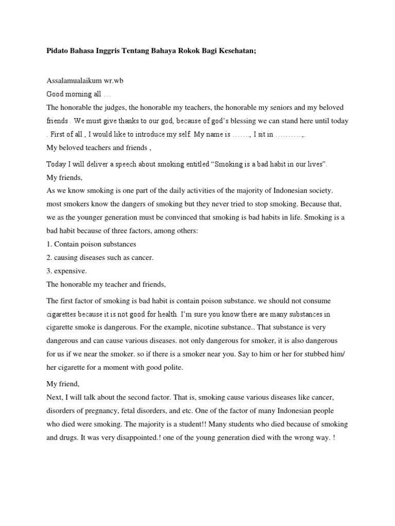 Contoh Naskah pidato bahasa inggris tentang kesehatan bahaya rokok. WB Commend be to thoughtful and merciful God simply as well as desire that accepts His assistance and mercy to those who obey Him that punishes thoes who disobey Him. Semua hadirin yang saya banggakan.