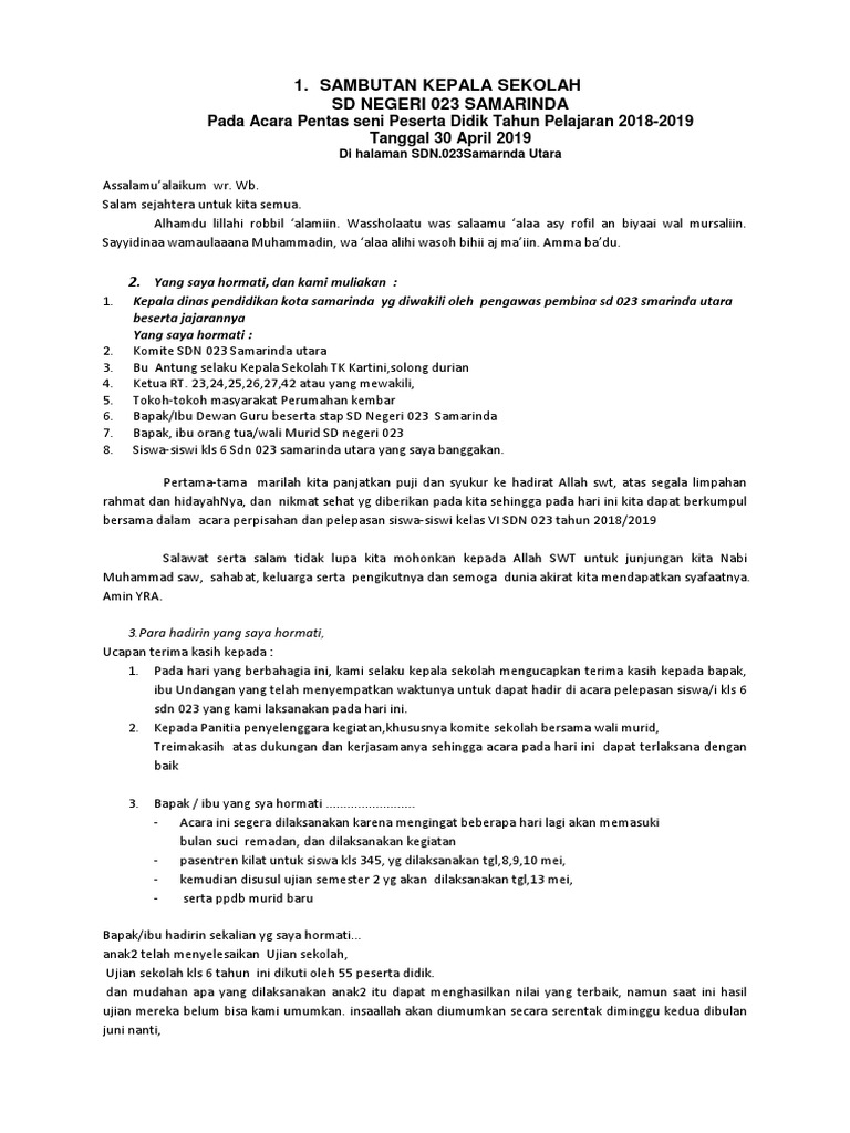 SAMBUTAN PERWAKILAN KELAS 6. Bapak kepala sekolah dewan guru maupun ketua komite akan merangkum saran maupun permasalahan yang ada kemudian kita carikan soiusi terbaik secara kekeluargaan bergotong royong dengan semangat kebersamaan sehingga tercapailah apa yang. Menjadi Kepala Sekolah selain memiliki tanggung jawab yang berat dituntut harus serba bisa alias mutitalent.