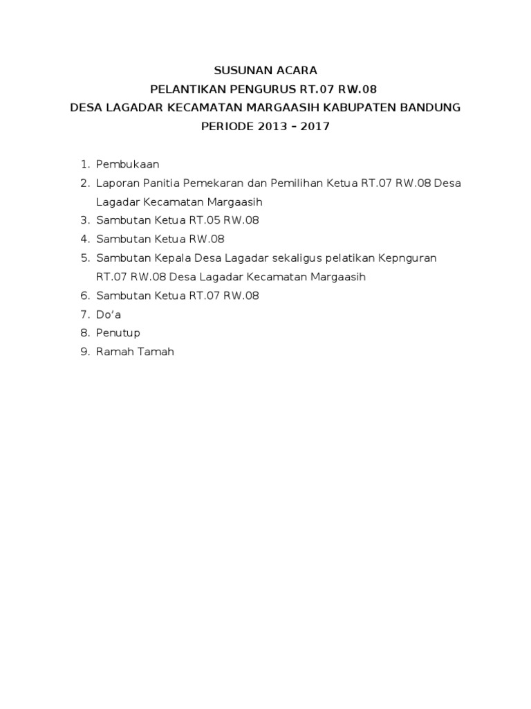 Orang terpenting disitu bisa kepala sekolah kepala desa atau camat. Contoh naskah pidato sambutan ketua rt rw lurah baru atau ketua osis. Pada hari ini SABTU tanggal 01 bulan NOVEMBER tahun 2014 ditempat ini saya Nama Ketua Lama menyerahkan jabatan Ketau Karang Taruna Ristansari kepada Sdr.