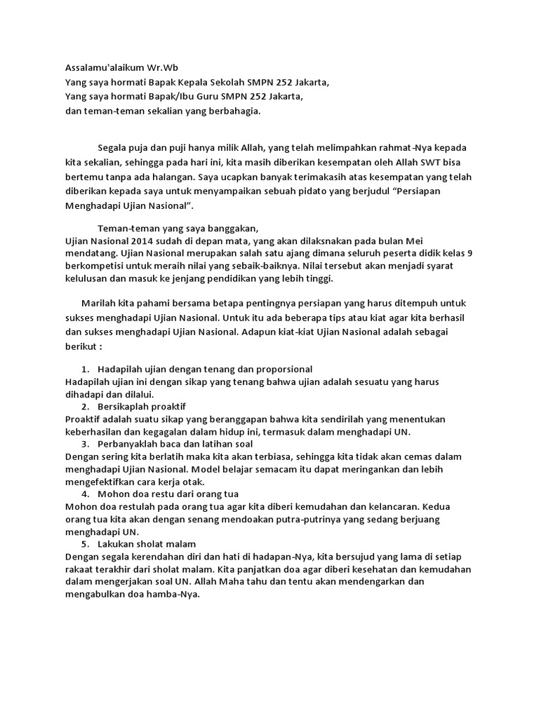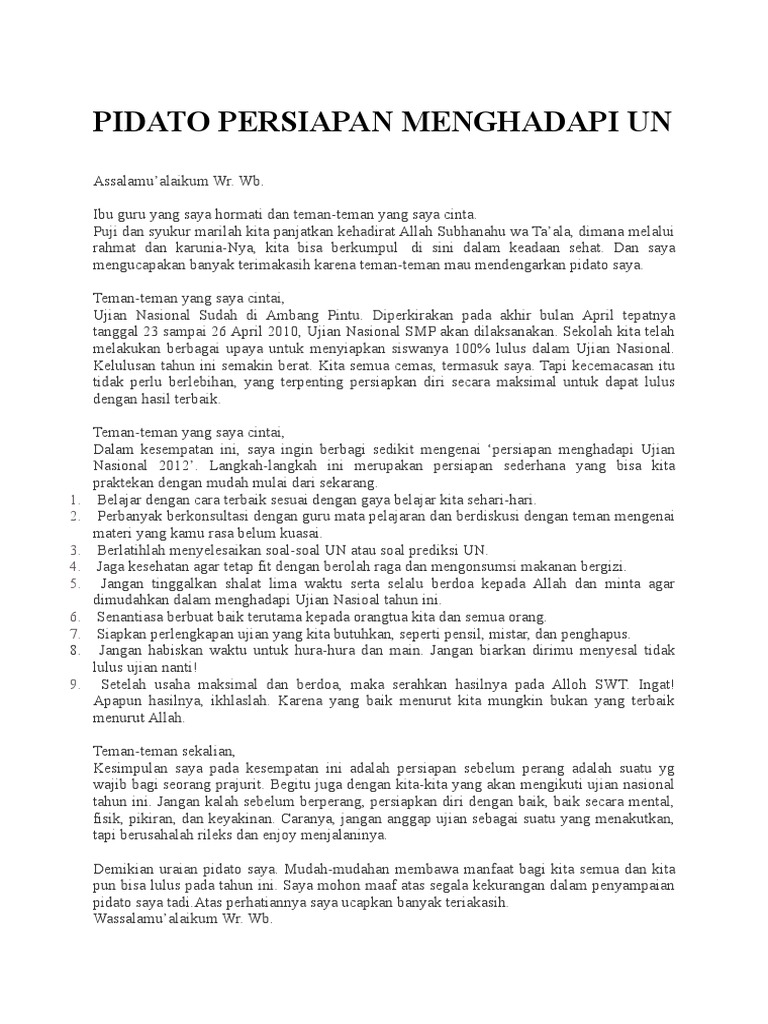 Pidato bahasa inggris tentang ujian nasional agar sukses menghadapi un ujian nasional sangat perlu untuk disampaikan kepada peserta ujian nasional sebelum mereka ujian. Contoh Teks Pidato Singkat Islami Assalamualaikum Warohmatullahi Wabarokatuh. Coba sesekali melatih dirimu untuk berpidato satu di antaranya dengan membuat teks pidato dan membacanya di hadapan cermin.