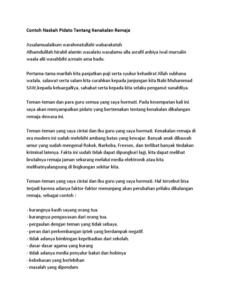 Alhamdulilah hirabil alamin wasalatu wasalamu alla asrafil anbiya iwal mursalin waala alii wasahbihi azmain ama badu. Contoh Teks Pidato Dengan Tema Pergaulan Remaja. Contoh Pidato Singkat Tentang Kenakalan Remaja dalam Bahasa Inggris Beserta Artinya.
