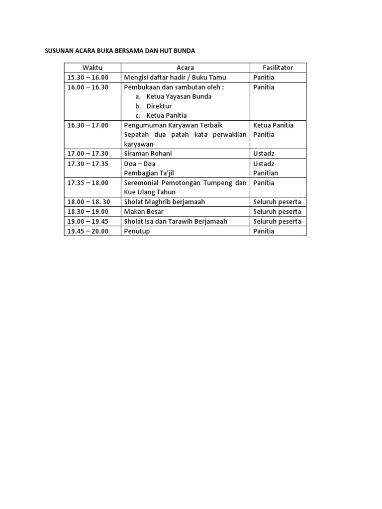 Susunan acara pembubaran panitia natal susunan acara doa pembukaan. Anak yatim buka bersama narotama rektor sambutan. Perusahaan Migas Ini Undang Mahasiswa Riau di Jakarta Buka Puasa.