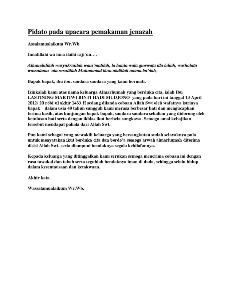 Contoh Sambutan Pelepasan Jenazah Oleh Shahibul Musibah Kajian Islam