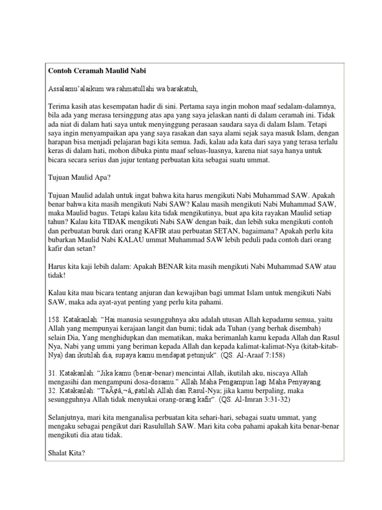 مولد النبي Mawlid an-Nabī adalah peringatan hari lahir Nabi Muhammad SAW yang di Indonesia perayaannya jatuh pada setiap tanggal 12 Rabiul Awal dalam penanggalan Hijriyah. Contoh Teks Ceramah - Pada kesempatan kali ini saya akan memberikan beberapa contoh teks ceramah singkat. Tahukah kamu bahwa teks pidato merupakan sebuah bentuk komunikasi searah.