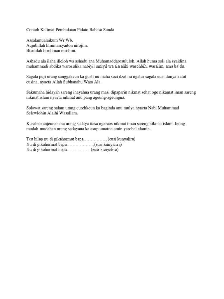 Alhamdulillahilladzi anama alaina bi nimatil iman wal islam. Puji anu jadi pangais ati Puja anu jadi panghias rasa Puji urang sungkeun ka Gusti nu maha suci nyaéta Alloh Robbul Izzati puja urang sanggakeun kanu maha kawasa nyaéta Alloh Azza Wazalla anu mana nitih wanci anu mustari ninggang dina mangsa anu lugina. Contoh Pidato Bahasa Sunda.