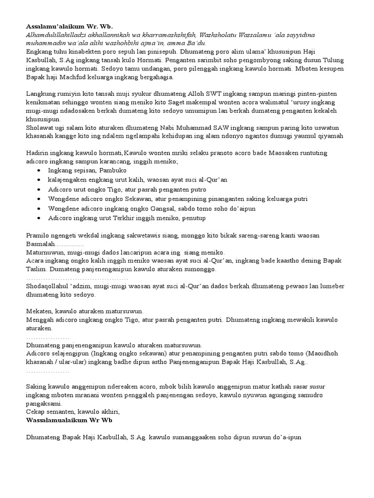 Kapingkalihipun sholawat maa salam kunjuk dumateng Nabi agung Muhammad Rosulillah SAW. Untuk lebih jelasnya dapat pembaca praktekkan teks berikut ini yang tentunya masih memungkinkan untuk ditambah dan atau dikurangi. Dalam pranatacara ada 6 bagian yaitu.
