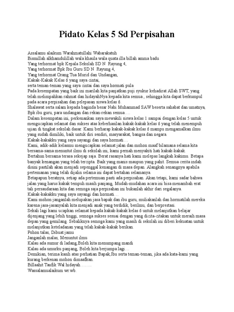 Contohnya pidato sambutan sambutan siswa sebagai perwakilan dari seluruh siswa dalam rangka perpisahan pileuleuyan paturay tineung dalam bahasa sunda atau pelepasan siswa kelas VI 6 enam di sekolah Dasar atau SD. Inilah pembahasan lengkap terkait contoh pidato anak sd tentang bulan ramadhan. Kembali pada ajaran ajaran A llah melaksanakan apa yang d icontohkan R osullullah agar kita benar benar menjadi ummat yang terbaik yang akan mendapat kan syapaat di hari akhir nanti.