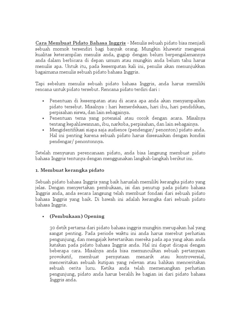 Point-point tersebut bisa berupa point pengenalan permasalahan point pendapat tentang permasalahan atau pun point tentang penyelesaian permasalahan tersebut. Cara terbaik dalam menyusun bagian isi dari sebuah pidato bahasa inggris adalah dengan menyusun point-point permasalahan yang akan disampaikan. Sedangkan mengutip dari wikipedia pidato merupakan sebuah kegiatan yang menyapaikan pendapat didepan umum atau berorasi.