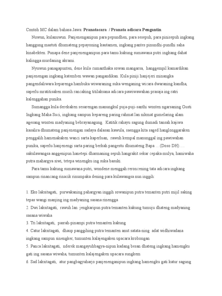 Contoh teks pranatacara manten bahasa jawa singkat Bismillahir-rahmanir-rahim. Contoh Pranatacara Pengajian Bahasa Jawa. CONTOH 7 Contoh Teks Pranatacara Bahasa Jawa Acara Ulang Tahun.