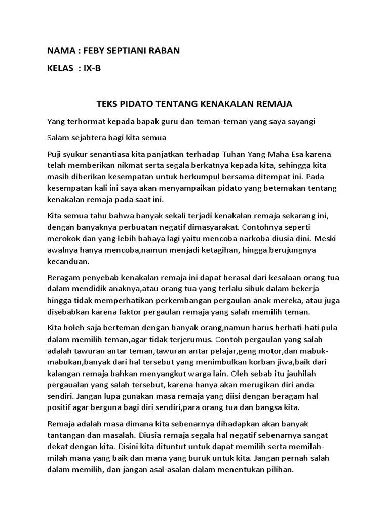 Dan solusinya pidato kenakalan remaja menurut islam pidato kenakalan remaja pdf pidato panjang 5 lembar pidato singkat tentang geng motor pidato tentang adab bergaul. Contoh pidato tentang Keteladana Remaja Kristen Syalom. Teks Pidato Singkat Tentang Kenakalan Remaja.