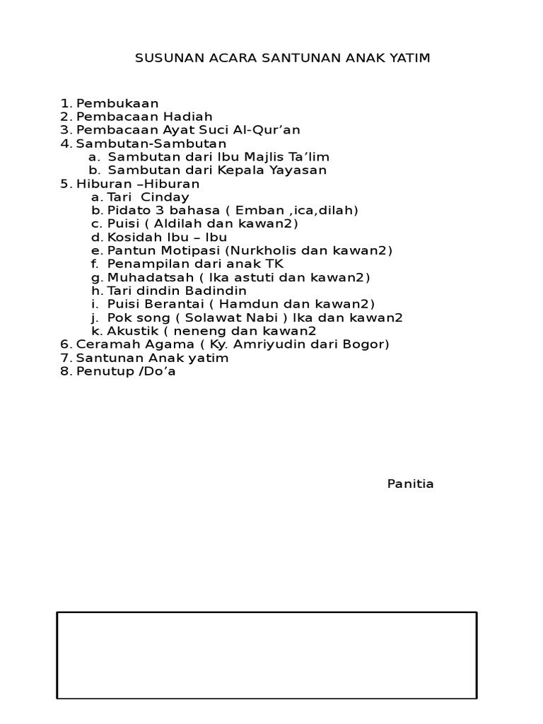 Panitia bakti sosial santunan anak. 1pembukaan 2pembacaan ayat suci al quran dan sari tilawah 3sambutan 4penyerahan santunan secara simbolis 5kuis cerdas cermat 6tausiyah dan doa penutup 7buka puasa bersama. Perlu diketahui anak yatim merupakan anak yang ditinggal mati oleh ayahnya sebelum memasuki usia baligh.