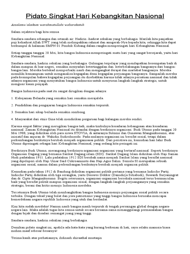 Pidato hari kebangkitan nasional adalah pidato memperingati bangkitnya rasa dan semangat persatuan kesatuan dan nasionalisme serta kesadaran untuk memperjuangkan kemerdekaan republik indonesia. 51625604 Teks Pidato Contoh Versi 2. Bapak Dan Ibu Guru Yang Saya Hormati Dan.