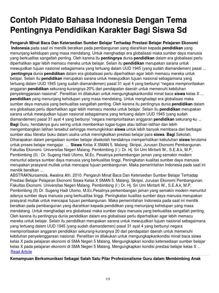 Contoh Pidato Bahasa Indonesia Dengan Tema Pentingnya Pendidikan Karakter Bagi Siswa Sd