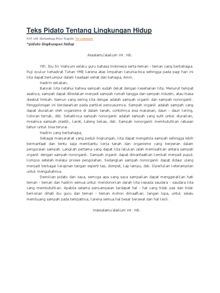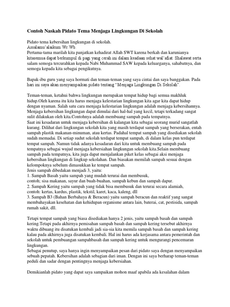 Teks pidato tema lingkungan hidup terbaik. Contoh Teks Pidato Lingkungan Hidup. Pertama-tama marilah kita panjatkan kehadirat Allah SWT karena. Contoh Naskah Pidato.