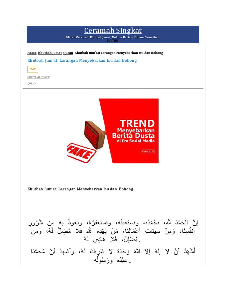 Bersyukurlah kita yang berhenti pada suatu kebohongan tidak menindak lanjuti dengan pernyataan palsu lainnya. Ciri - Ciri Teks Pidato. Jadilah Muslim yang Cerdas.