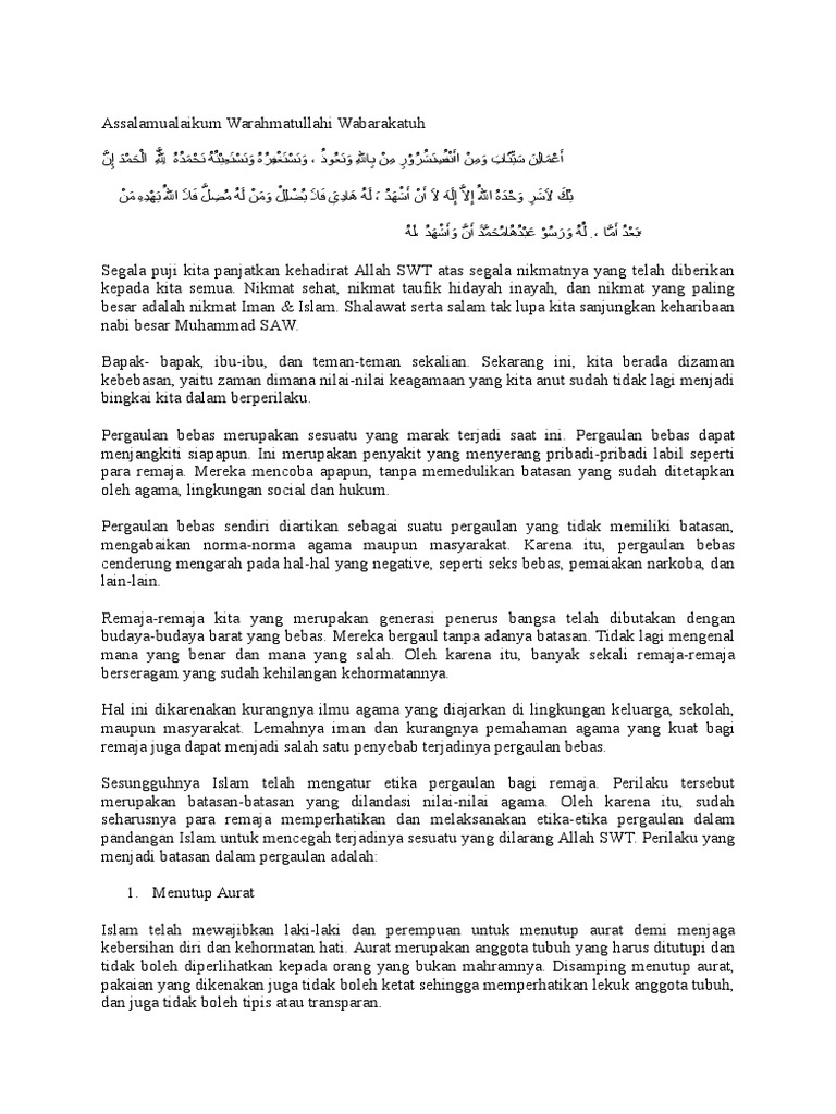 Tak hanya terjadi di perkotaan saja pergaulan bebas juga kerap terjadi di pedesaan. Bapak-Bapak dan Ibu-Ibu sekalian Di pagi yang cerah ini marilah kita mengucap syukur pada Sang Illahi atas rahmat dan karunia yang telah Dia berikan sehingga kita bisa berkumpul di tempat yang damai ini. Kenakalan remaja bahaya rokok disiplin pergaulan bebas dll.